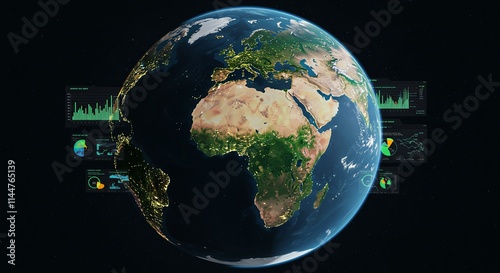 A detailed view of Earth with lush vegetation and data analytics on display, showcasing the beauty of our planet.