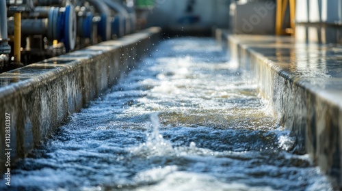 A detailed view of machinery and equipment actively working at a wastewater treatment facility.