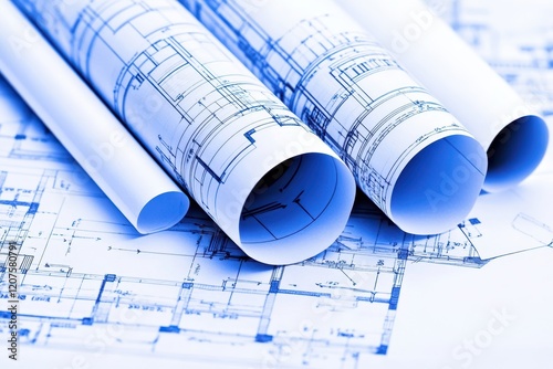 A detailed view of neatly rolled blueprints, their crisp edges revealing intricate designs, sprawled across a wooden table in vibrant blue hues.