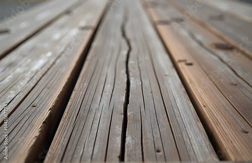 A detailed view of weathered wood planks reveals deep cracks and a worn surface over time._00001_