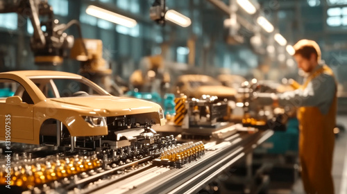 A detailed view showcasing the assembly line process for car manufacturing with robots and skilled workers at play.