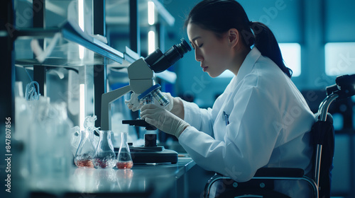 A determined Asian scientist in a wheelchair studies DNA samples under a microscope in a modern lab, contributing to innovative cancer research.