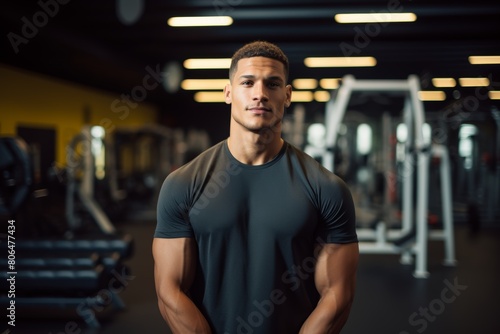 A Determined Athlete's Portrait of Focus and Strength with a Vibrant Gym Full of Exercise Equipment in the Background
