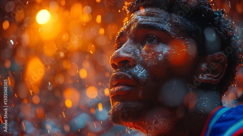 A determined basketball player with sweat and rain on his face looks intense under bright lights during a game