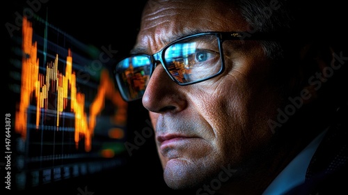 A determined businessman examines stock market data reflecting in his glasses, deep in thought.