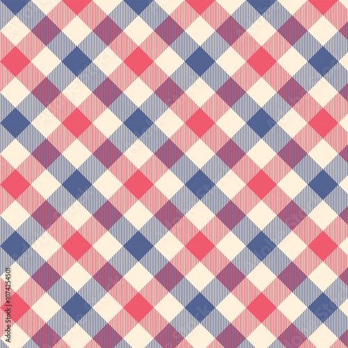 A diagonal gingham checkered pattern, with intersecting lines forming blue, red, and beige diamond shapes. The design features a crisscross arrangement and maintains a traditional aesthetic.