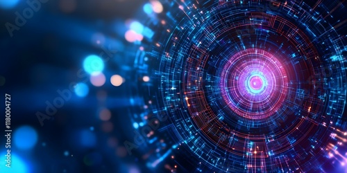 A digital abstract pattern featuring concentric circles with glowing lines and light effects, conveying a futuristic theme. Concept Digital Abstract Art, Concentric Circles, Glowing Lines