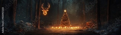 A digital backdrop depicting a dark forest with tall trees and a glowing deer head in the background