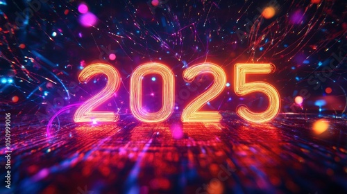 A digital background featuring the text "2025" in bright neon colors, creating a festive atmosphere for New Year's Eve. The backdrop with swirling lights creates depth, providing space to add content