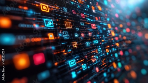 A digital background with various icons and symbols in a futuristic style, glowing with orange and blue lights.
