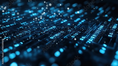a digital binary code matrix with glowing green and blue binary digits cascading down in a 3D environment,