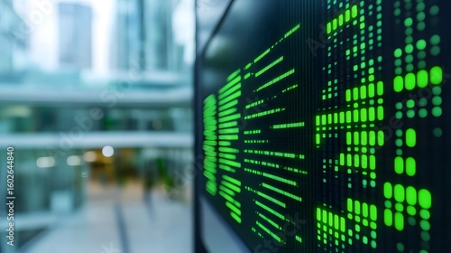 A digital board displays green stock market data, blurred cityscape in the background, representing financial trading and investment environments.