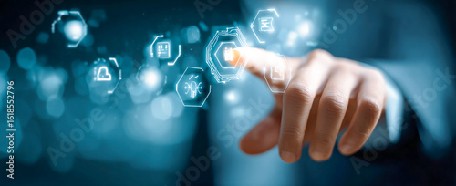 A digital business person touching a virtual screen with artificial intelligence technology,