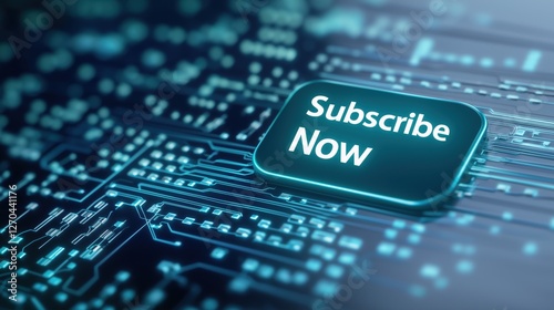 A digital button with "Subscribe Now" overlaid on a circuit board background, symbolizing online engagement and technology.