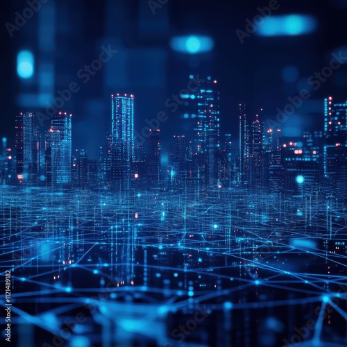 A Digital Cityscape with Glowing Blue Lines and Nodes