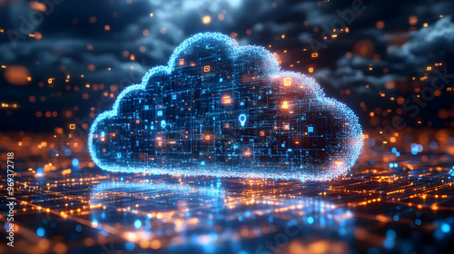 A digital cloud symbolizing data storage and connectivity with glowing elements.
