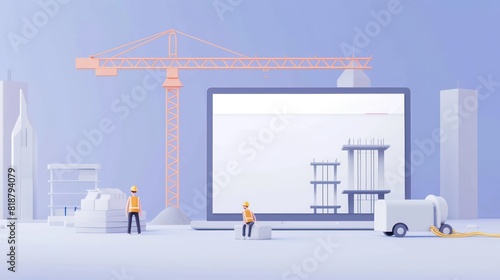 A digital composition presenting a minimalist construction scene with workers, a laptop as a billboard, and a crane