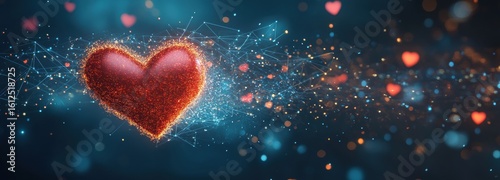 A digital email icon soars through a vibrant landscape, adorned with a glowing red heart seal, surrounded by twinkling hearts and shimmering particles that create a sense of joy and connection