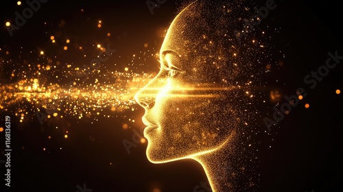A digital face profile formed with light patterns and soft curves, symbolizing modern design and technology, on a neutral background