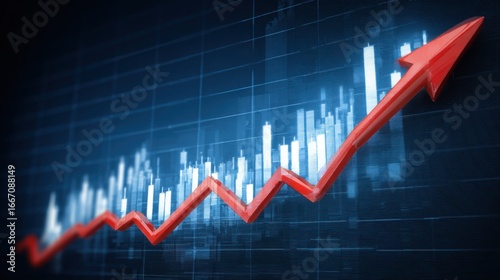 A digital financial graph shows a steep increase, with a prominent red arrow pointing upwards against a dark background. This illustrates significant growth in market metrics and economic performance.