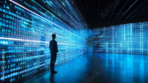 A digital gallery or public space. Focus on interactive artworks that use digital textures