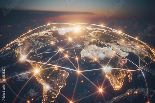 A digital globe with global network connections, representing the vast and interconnected nature of technology's reach across continents, set against a dark background with light effects