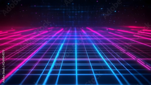 A Digital Grid Background with Neon Blue and Pink Lights, Creating an Otherworldly Atmosphere for Retro Video Game-Inspired Visuals, Evoking a Futuristic and High-Tech Vibe with Bold, Vibrant Colors
