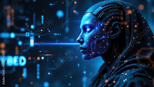 A digital illustration depicting a humanoid robot's face with a cybernetic interface, surrounded by abstract technological elements.