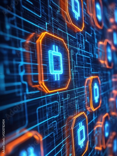 A digital illustration featuring interconnected blue and orange symbols on a circuit-like background, representing cryptocurrency or blockchain technology.