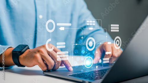 A digital illustration of a business analytics interface overlaid on a laptop workspace