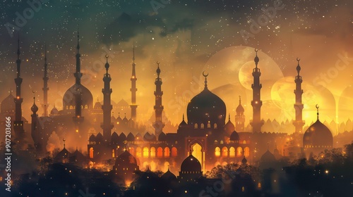 A digital illustration of a cityscape at night featuring silhouetted mosques against a glowing yellow and gold sky with multiple moons and stars.
