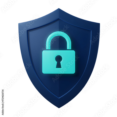 A digital illustration of a dark blue shield with a glowing cyan padlock symbol in the center, representing security and protection.