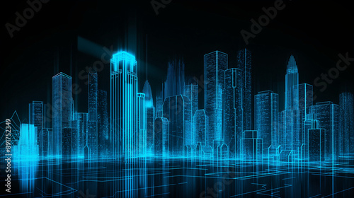 A digital illustration of a futuristic city skyline rendered in neon blue lines against a dark background. The skyscrapers indicate advanced technology and urban development