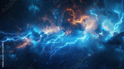 A digital illustration of a powerful storm with bright blue lightning bolts and dark, swirling clouds against a background of a starry night