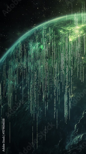 A digital interpretation of a futuristic planet with flowing green energy patterns.