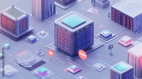 A digital landscape depicting server architecture and data flow in a modern tech environment.