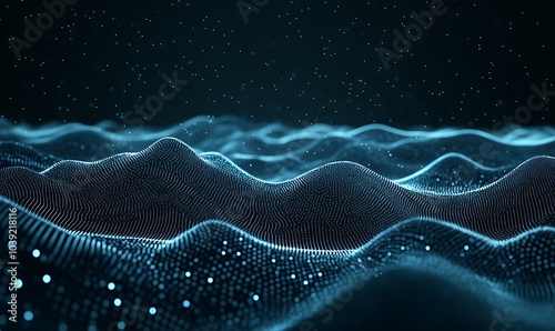 A digital landscape of blue waves and particles, creating a futuristic and abstract scene reminiscent of data visualization.