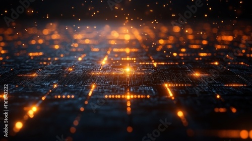 A digital landscape with glowing orange lines and particles, representing technology and innovation.