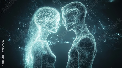 A digital man and woman face each other, illuminated by neural connections, symbolizing the merging of human relationships and futuristic technology.