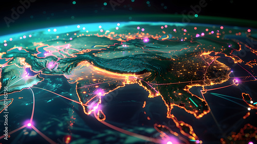 A digital map of Asia and the Middle East, highlighted with vibrant glowing connections and network lines, representing futuristic global technology and communication