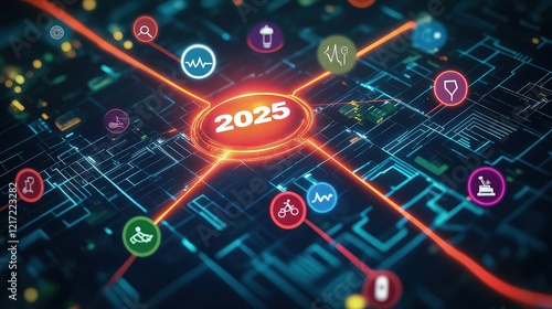 A digital map with a glowing trail leading to a bright "2025" destination, surrounded by icons representing different goals such as health, wealth, and creativity