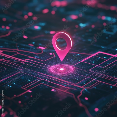A digital map with dynamic colors and a neon pink location pin, symbolizing tech-driven exploration, with subtle grid lines for a futuristic feel.