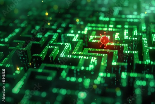 A digital maze teeming with glowing green code, a single red virus particle navigating through the labyrinth, photorealistic