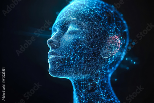 A digital mesh of glowing nodes forms the visage of a human, symbolizing interconnectedness and the modern digital human experience.