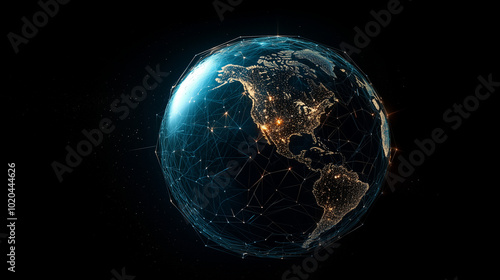 A digital model of the earth made of hexagonal and triangular facets, with each country connected by luminous geometric pathways. This visual represents the intertwining of busines