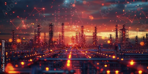 A digital network of interconnected nodes on a logistics optimization backdrop enhances industrial logistics efficiency.