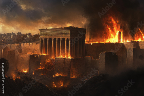 A digital painting depicting the destruction of the Temple of Jerusalem on Tisha B'Av, with flames rising from the ruins as the holy city succumbs to fire and chaos. The dark, stormy skies reflect the