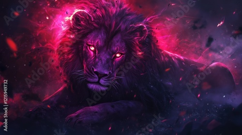 A digital painting of a majestic lion with glowing red eyes surrounded by cosmic light