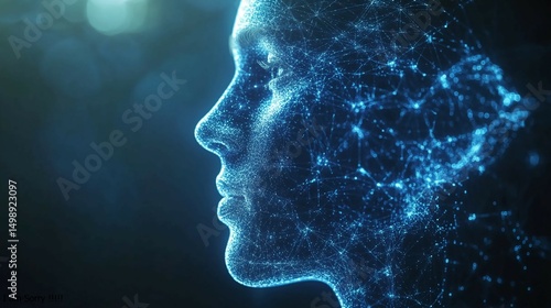 A digital phantom face a glimmering portrait of the AI consciousness emerging from the shadows and dots Glowing blue