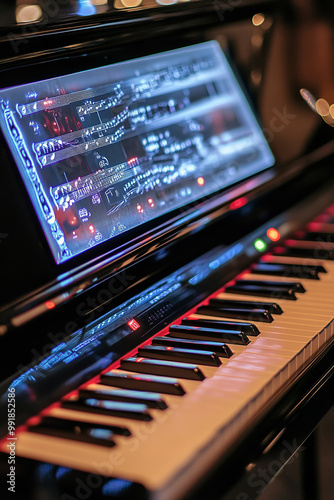 A digital piano with an LED screen, displaying sheet music and playing guides for various song genres